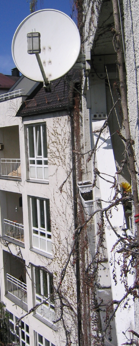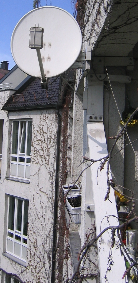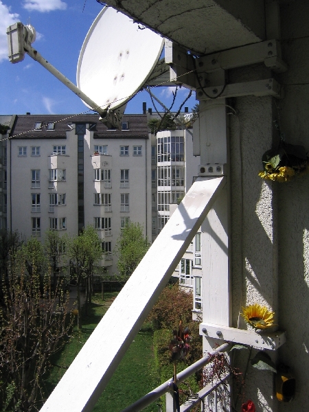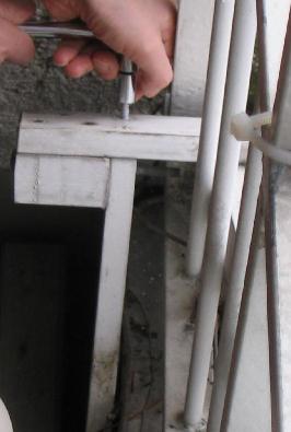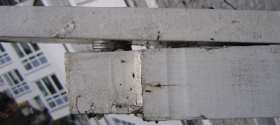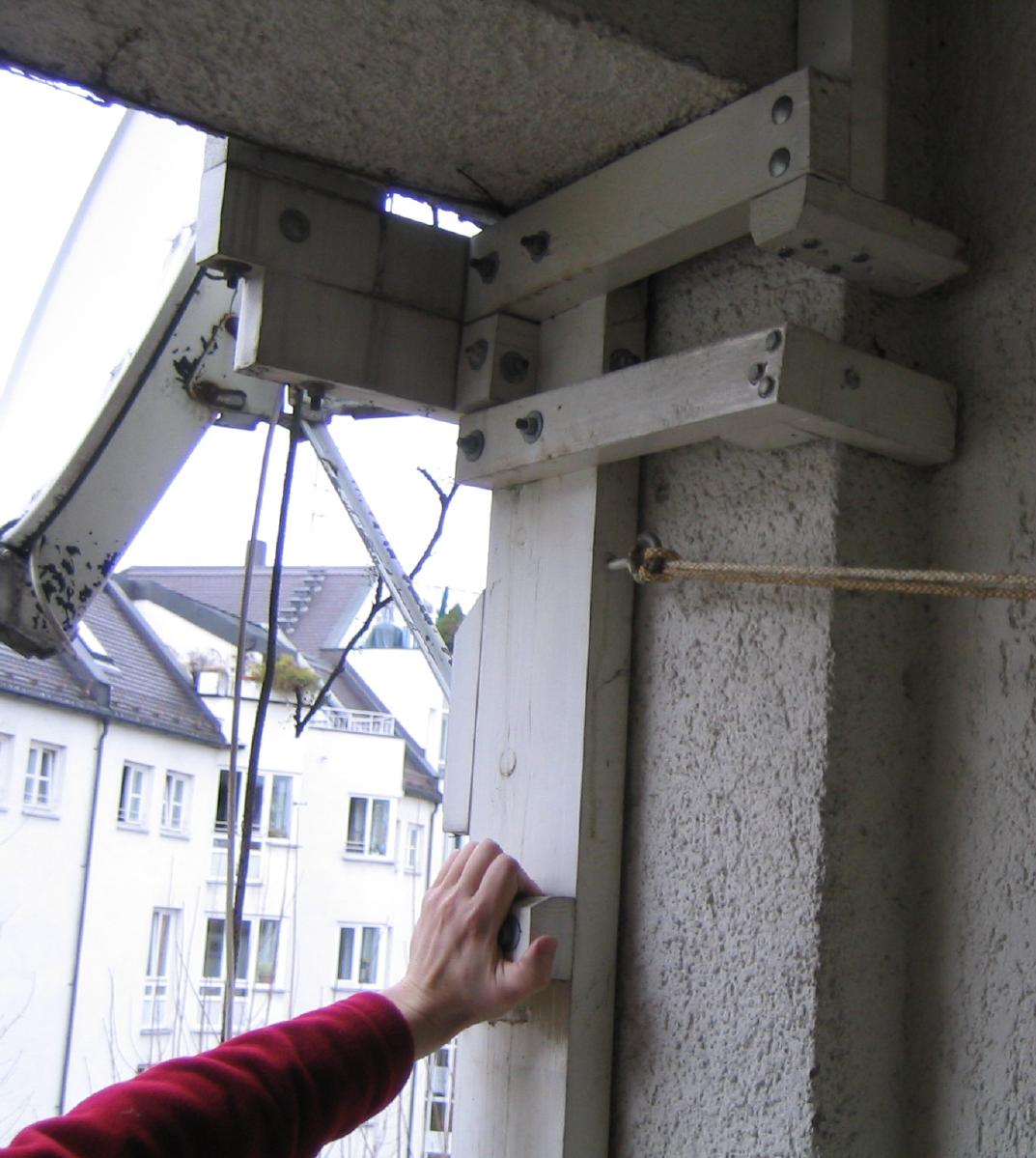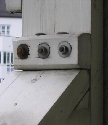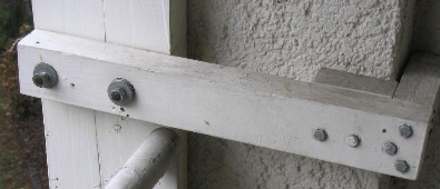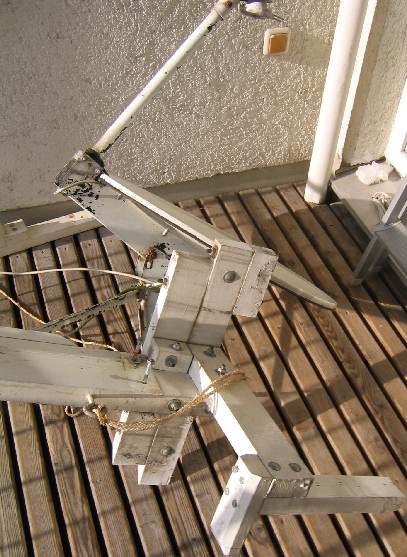 The foot. (There's metal protruding out of wall & over balcony at the edge, to provide a water tight seal, so my construction steps clear of that, applying the load to flat metal further out. It also makes the vertical the right height, as the timber I had to hand also wasn't quite long enough. The extension was also at the base, so that if it rotted in harsh Bavarian winters, it was easily unbolted & replaced. The picture shows only slight deterioration by March 2005 (after (at a guess) 15 years in place, when it's now been de-constructed & will be cleaned, sanded & repainted.