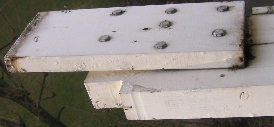 (Actually I previously unbolted just 2 bolts further out on the main diagonal, but one is now loose within its hole, spins & won't unbolt. This bracket being on top of the diagonal, it catches the rain & snow, & the screwdriver shows it a little soft, so as I needed to saw the wood out & make a new bit, I'll bolt the replacement underneath, to allow unrestricted rain & snow run off for the Mark 2.