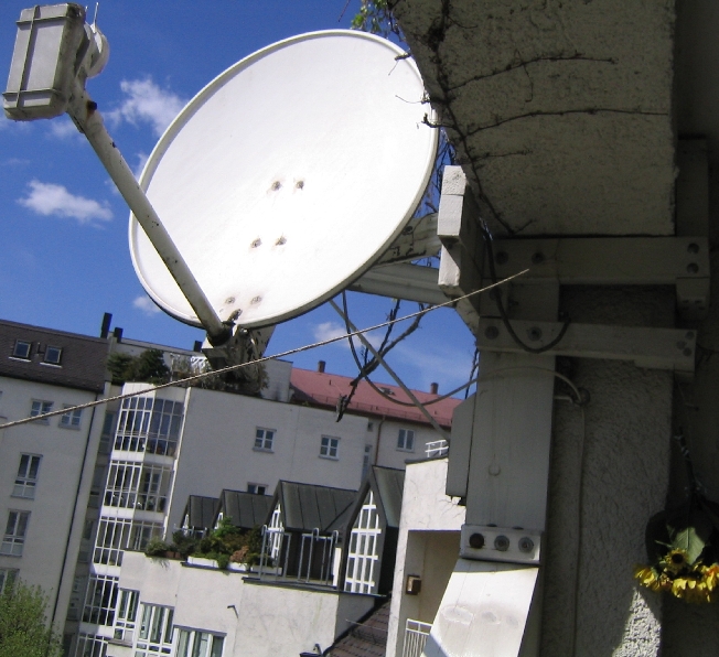 Note the rope from metal hook to back of balcony, tied round strong drain pipe, which has been in place throughout de-construction up to this point for safety, but which is now removed from drain pipe & held by 2nd man flat to wall at back of balcony, to prevent vertical swinging out into space. Meanwhile 1st man at front of balcony lift the vertical (with dish still bolted on top) about a centimetre, & cautiously push foot out about 2cm to clear balcony rail thickness, then slides base to left, while pushing top of vertical flat to wall to prevent wobble. The slide of base to left continues, & the 2nd mechanically aware man moves when its obviously right time, to help front man haul whole vertical + satellite dish up & over rail.